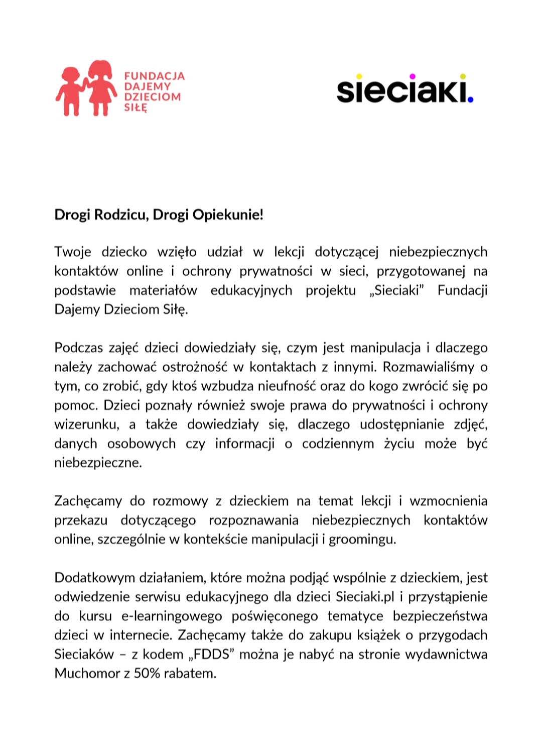 Zachęcamy do obejrzenia krótkiej fotorelacji. Prezentujemy również przekazany przez Fundację list do rodziców, którego celem jest wzmocnienie przekazu z zajęć.