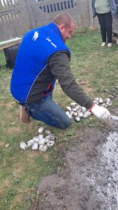 Nie zabrakło też kulinarnych wrażeń – pieczone ziemniaki i kompot znikały bardzo szybko! Na zakończenie spotkania odbyło się oficjalne losowanie zwycięzców konkurencji, którzy otrzymali drobne upominki.