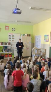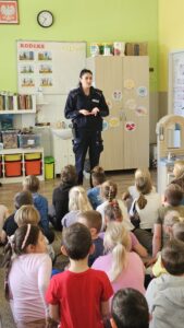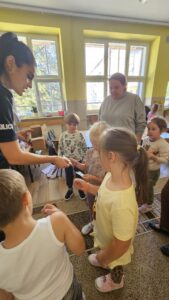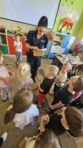 Pani policjantka rozmawiała z dziećmi o zasadach bezpieczeństwa w ruchu drogowym, podkreślając ważną rolę elementów odblaskowych, kasków na głowach czy zapiętych pasów w pojazdach.🚸⛔️