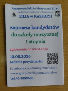Zapraszamy wszystkich chętnych do rozpoczęcia muzycznej przygody w Państwowej Szkole Muzycznej I stopnia w Kaskach. To doskonałe miejsce, aby rozwijać swoje talenty i pasję do muzyki pod okiem doświadczonych nauczycieli. Zgłoszenia przyjmowane są do 30 kwietnia 2026 roku, a badanie przydatności odbędzie się 13 maja 2026. Nie zwlekaj – dołącz do świata muzyki już dziś! 🎶Audycja muzyczna w wykonaniu Państwowej Szkoły Muzycznej w Żyrardowie.