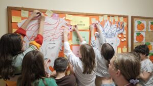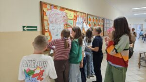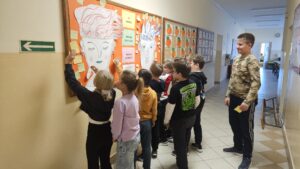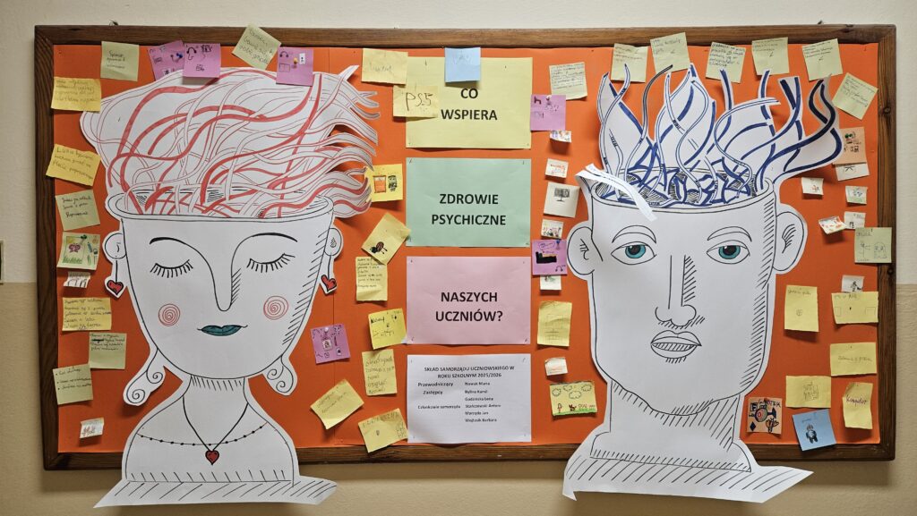 Powstała również, przepiękna interaktywna gazetka pt. “Co wspiera zdrowie psychiczne naszych uczniów?”, na której to uczniowie zawieszali własne pomysły, różnych sposobów na regulację napięcia i emocji, relaksację i poprawę nastroju, pokazując nam, za pomocą słow i niewielkich obrazków, swoją przestrzeń na odpoczynek psychiczny i emocjonalny.