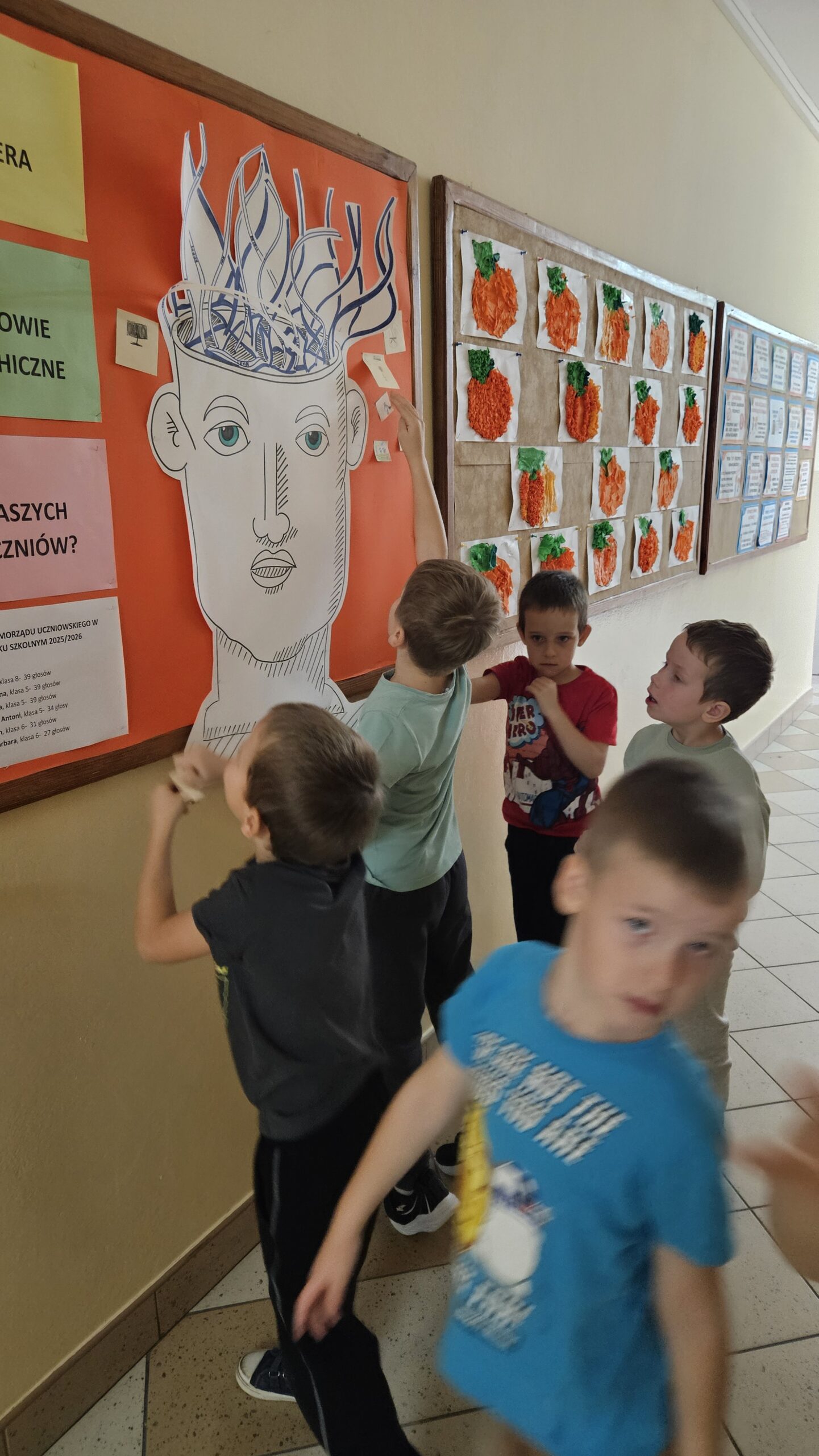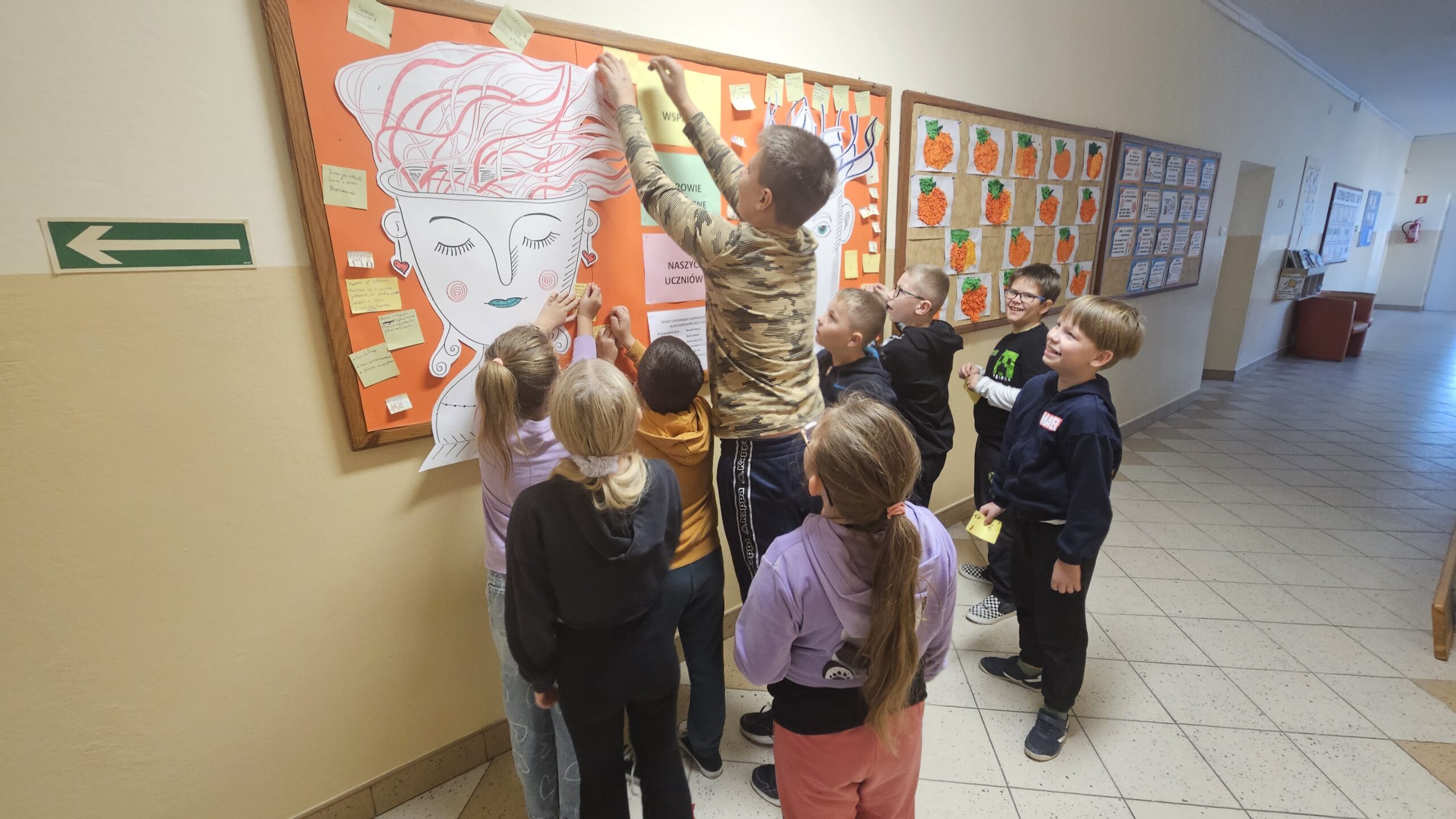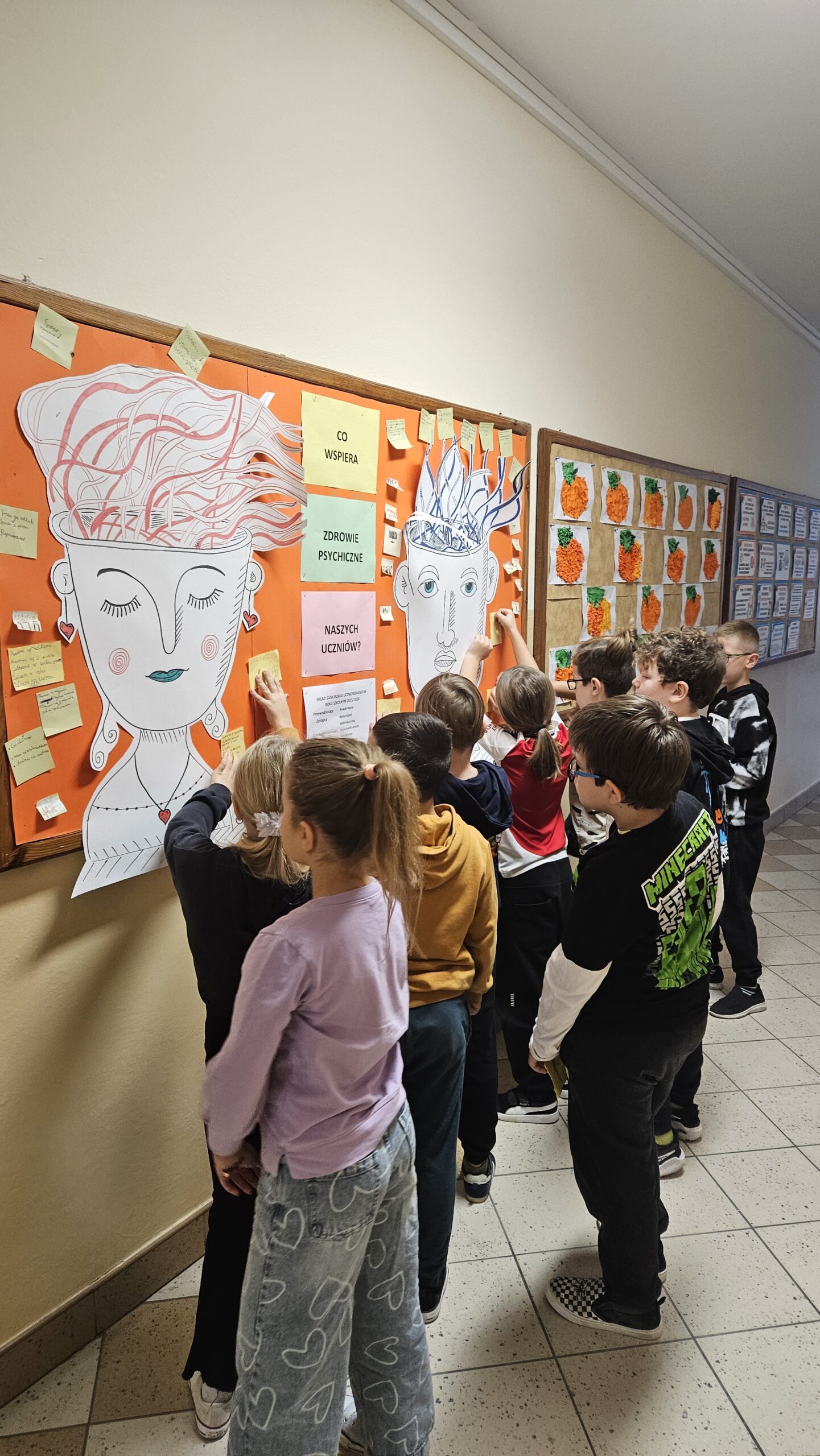 Powstała również, przepiękna interaktywna gazetka pt. “Co wspiera zdrowie psychiczne naszych uczniów?”, na której to uczniowie zawieszali własne pomysły, różnych sposobów na regulację napięcia i emocji, relaksację i poprawę nastroju, pokazując nam, za pomocą słow i niewielkich obrazków, swoją przestrzeń na odpoczynek psychiczny i emocjonalny.